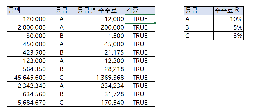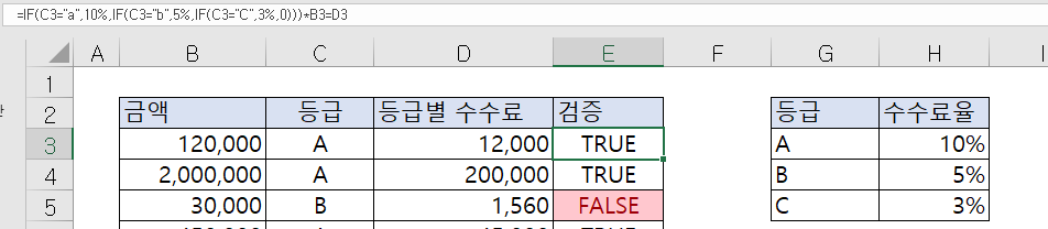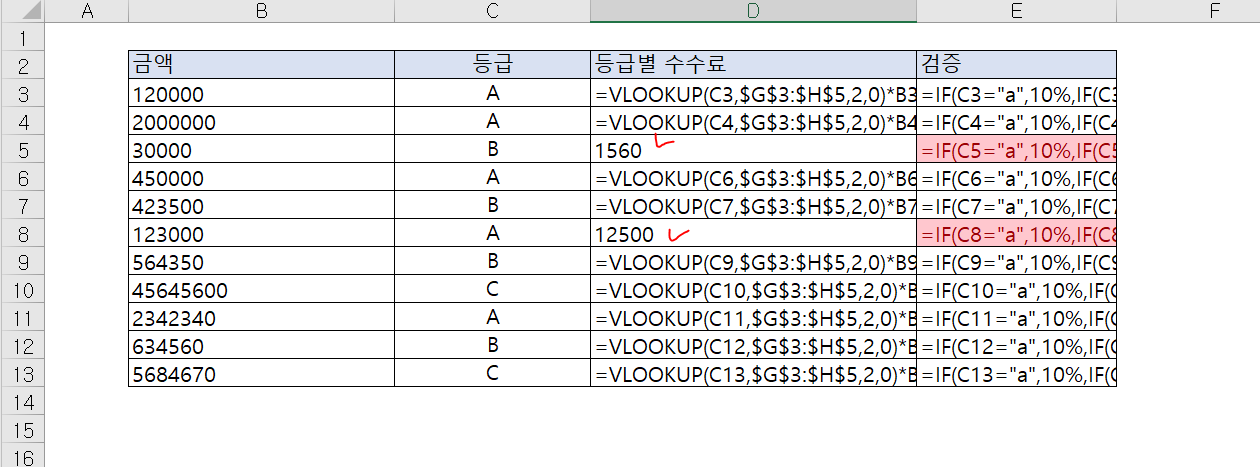 지금은 별도의 검증 셀을 등급별 수수료 수식과 다르게 만들어두었기 때문에 틀렸다는 점을 바로 인지 할 수 있습니다.