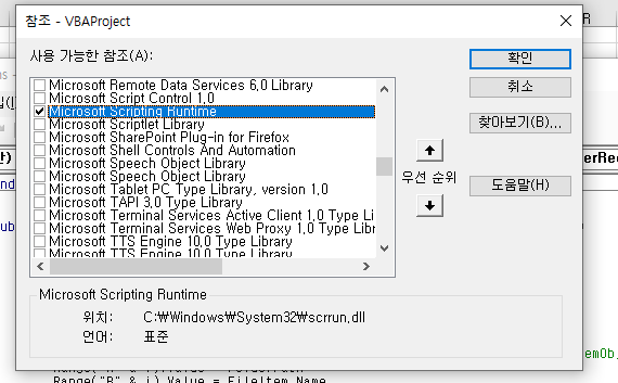 도구-참조에 다음 사용가능한 참조 추가 마이크로 소프트 스크리핑 런타임